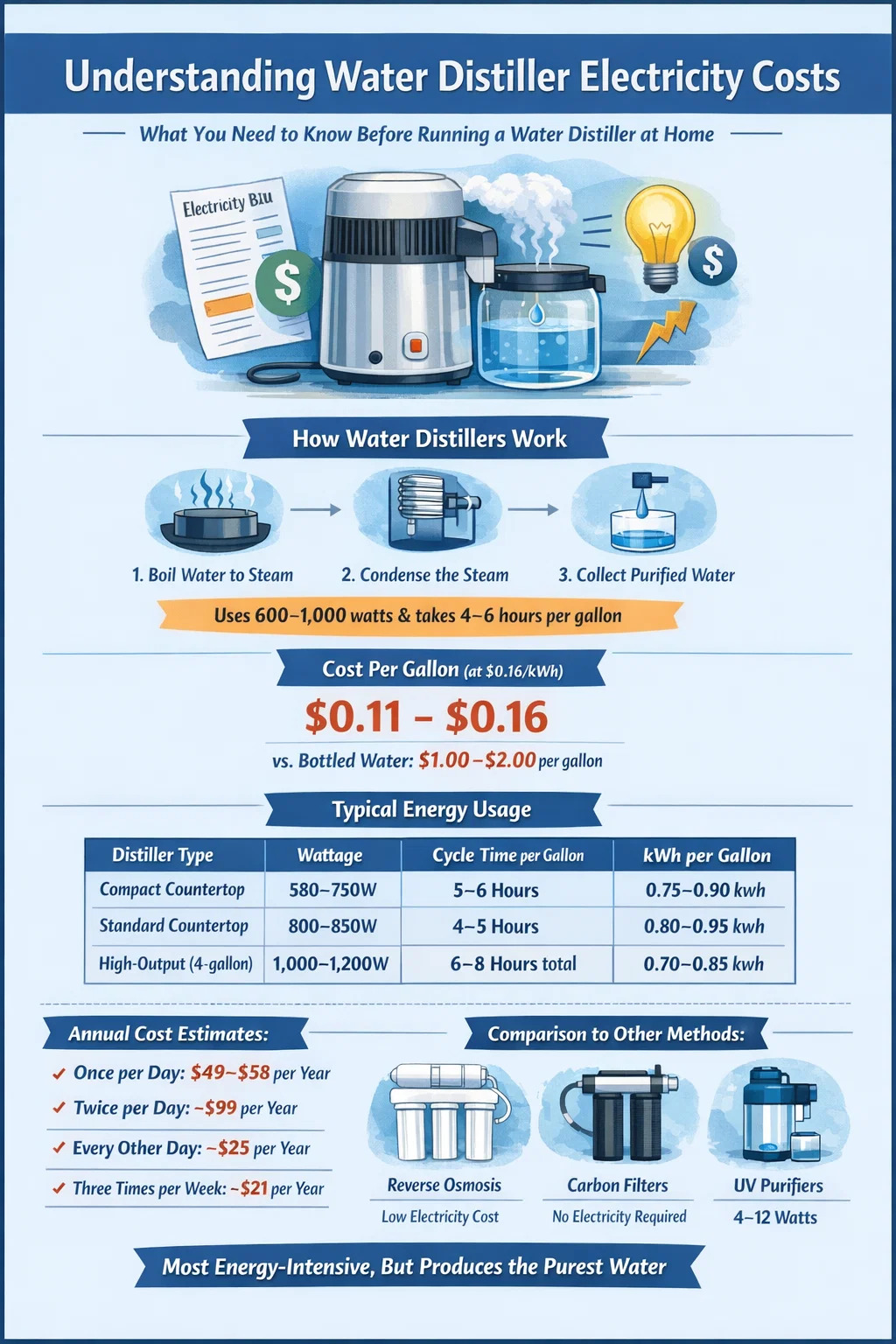 Pour la plupart des ménages aux États-Unis, où le tarif moyen de l'électricité se situe autour de 0,16 $ le kWh, la production d'un gallon d'eau distillée coûte entre 0,11 $ et 0,16 $ . Faites fonctionner le distillateur une fois par jour pendant une année complète, et vous obtenez environ 40 à 58 dollars par an rien qu'en électricité. C'est bien moins que l'achat d'eau distillée en bouteille au magasin, qui coûte généralement entre 1 et 2 dollars le gallon, mais c'est nettement plus que ce que coûterait un système d'osmose inverse ou un simple filtre à charbon pour fonctionner.