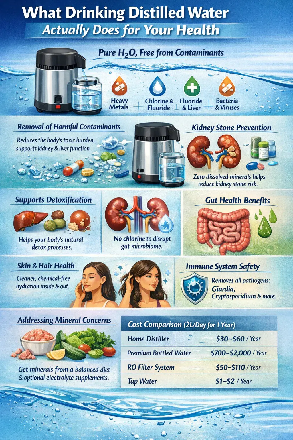 Les bienfaits pour la santé de la consommation d’eau distillée sont réels, mais ce sont avant tout les bienfaits de l’absence : l’absence de contaminants, d’agents pathogènes, de minéraux indésirables et d’additifs chimiques. Ce n’est pas une mince affaire. Sachant que l'individu moyen consomme environ 700 à 1 000 litres d'eau par an , la différence cumulée entre une eau constamment propre et une eau contaminée au cours d’une vie est significative.
