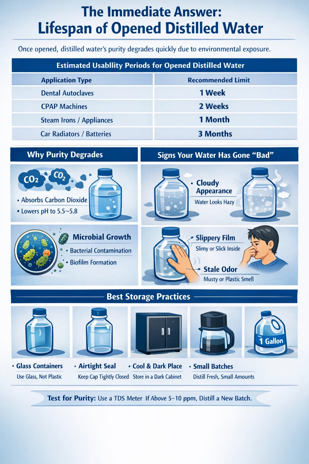 Une fois qu’une bouteille d’eau distillée est ouverte, son statut de haute pureté commence à se dégrader en raison de l’exposition à l’environnement. À des fins médicales ou dentaires, comme l'utilisation dans un autoclave, l'eau distillée ouverte dure généralement 7 à 14 jours s'il est stocké correctement dans un endroit frais et sombre. Pour les appareils électroménagers comme les fers à vapeur ou les humidificateurs, il peut rester utilisable pendant jusqu'à 30 jours . Bien que l'eau ne se « détériore » pas de la même manière que les aliments, elle absorbe de manière agressive le dioxyde de carbone et les particules en suspension dans l'air, ce qui peut modifier son pH et introduire des contaminants microscopiques qui annulent les avantages de l'utilisation d'un distillateur d'eau .