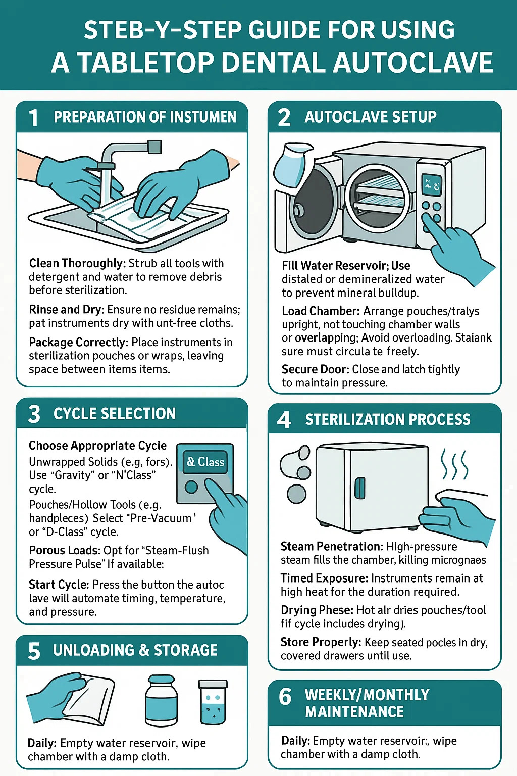 Voici un guide clair, étape par étape, pour utiliser un autoclave dentaire de table :
