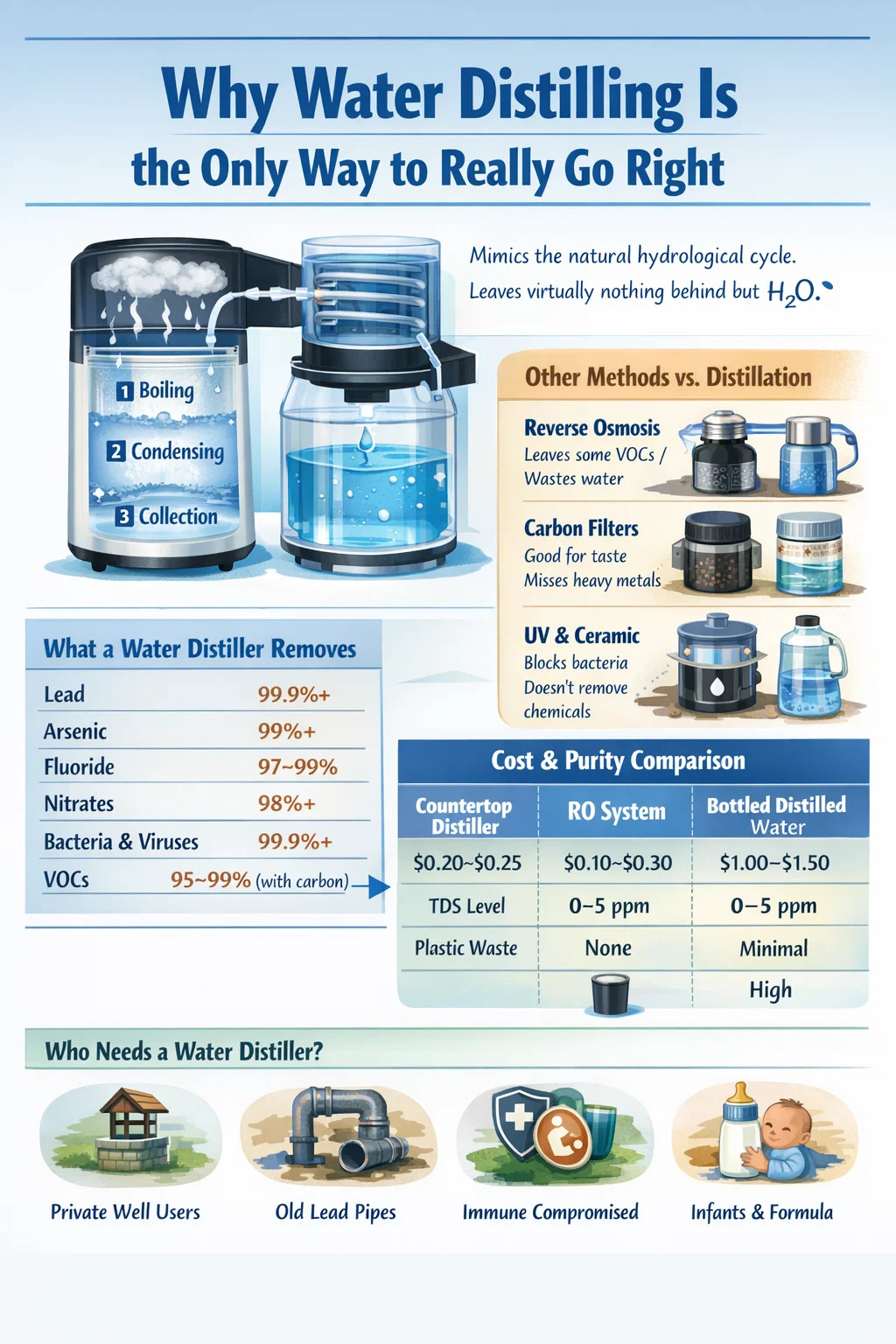 Si vous avez consacré du temps à des recherches sur la purification de l'eau, vous avez probablement rencontré des filtres à osmose inverse, des blocs de charbon actif, des stérilisateurs UV et des filtres en céramique. Ils promettent tous de l’eau propre. Certains d’entre eux font un travail décent en éliminant des contaminants spécifiques. Mais aucun d’entre eux ne se rapproche de ce que fait réellement un distillateur d’eau. Quand les gens disent que la distillation de l’eau est la seule façon de vraiment réussir, ils ne sont pas dramatiques. Ils décrivent un processus physique qui imite le cycle hydrologique et ne laisse pratiquement rien derrière lui, à l'exception des molécules H₂O.