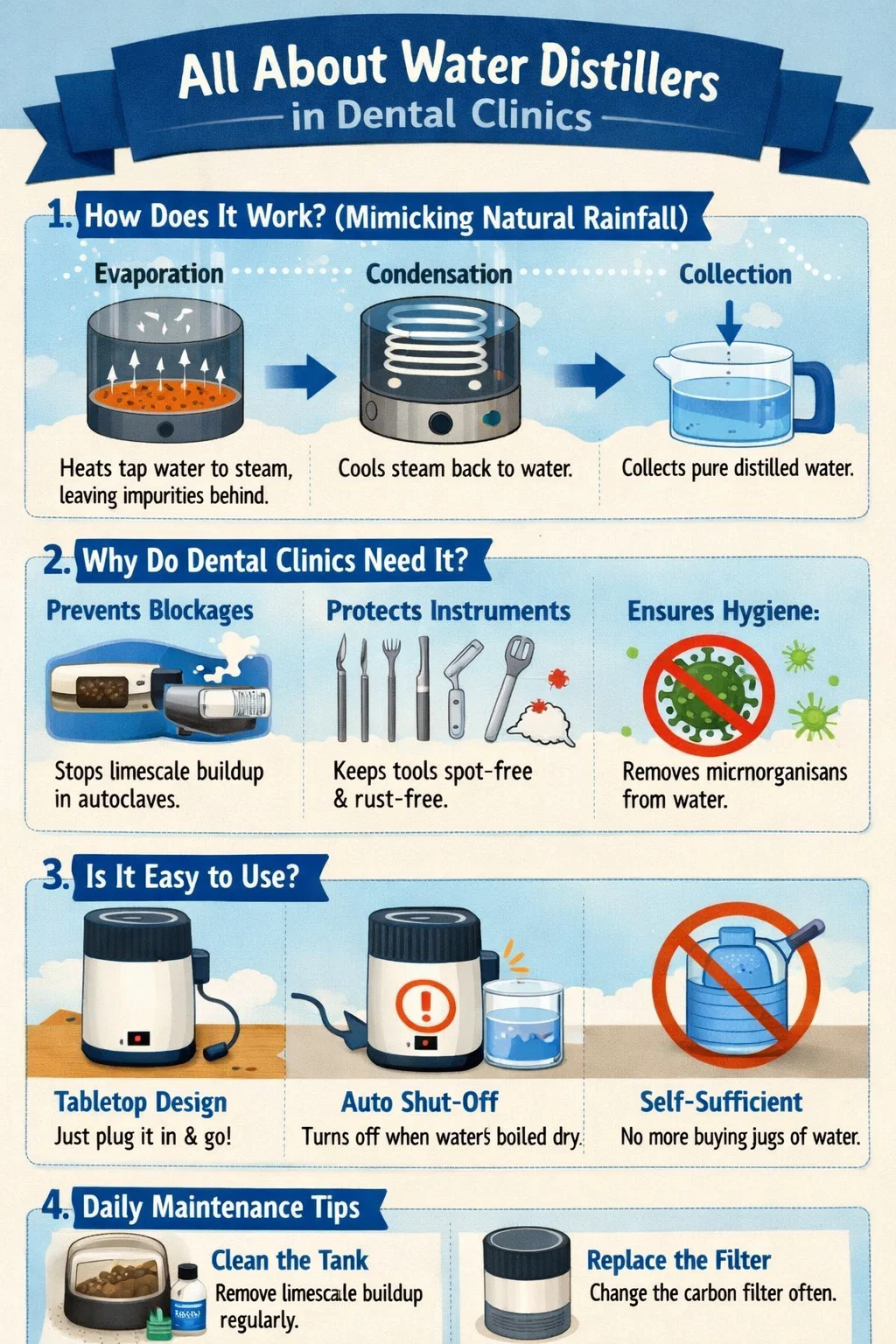 Un distillateur d'eau est essentiellement une petite usine dédiée à la production d’« eau pure ». Dans les cliniques dentaires, c'est généralement le meilleur partenaire des autoclaves dentaires, car les autoclaves sont très « pointilleux » sur l'eau qu'ils utilisent et ne peuvent utiliser que cette eau distillée propre.