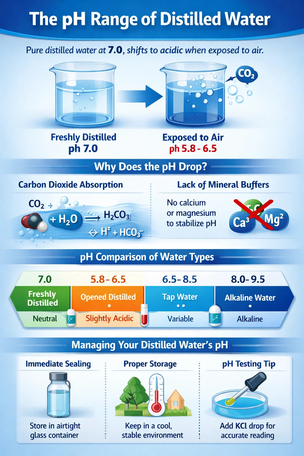 La solubilité du CO2 augmente à mesure que l’eau refroidit. L'eau fraîchement distillée est souvent tiède ; à mesure qu’il atteint la température ambiante, il absorbera les gaz plus rapidement. Garder votre conteneur de stockage dans un environnement stable et tempéré permet d'éviter fluctuations drastiques du pH .