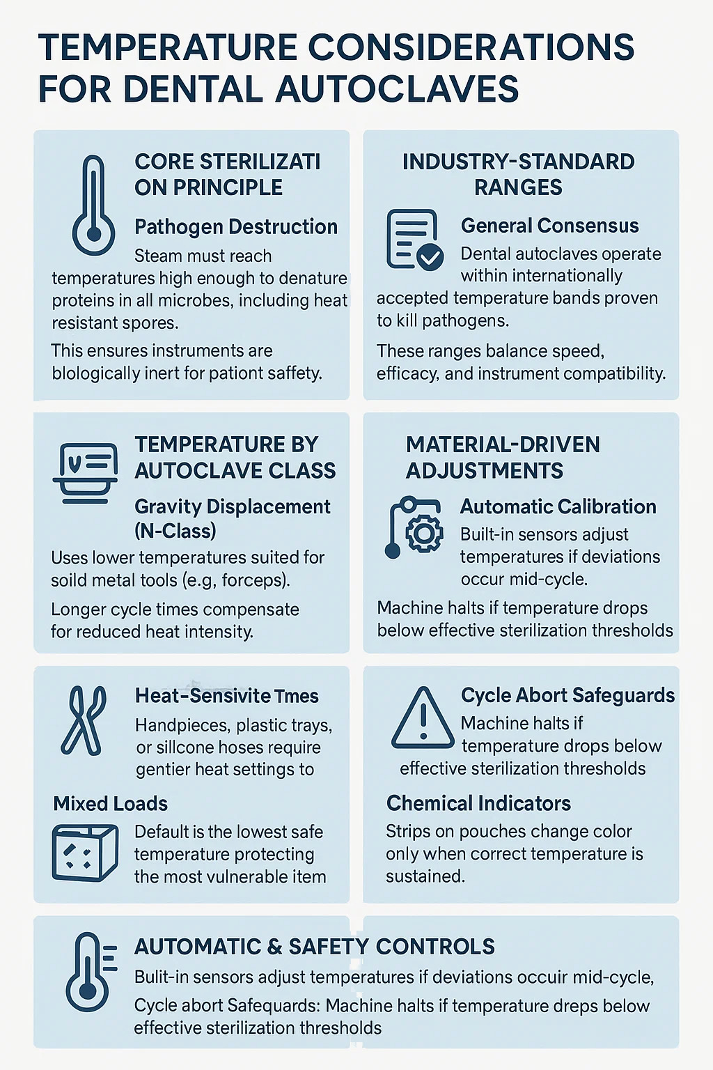 Les autoclaves dentaires fonctionnent dans des plages de températures internationalement acceptées et éprouvées pour tuer les agents pathogènes.