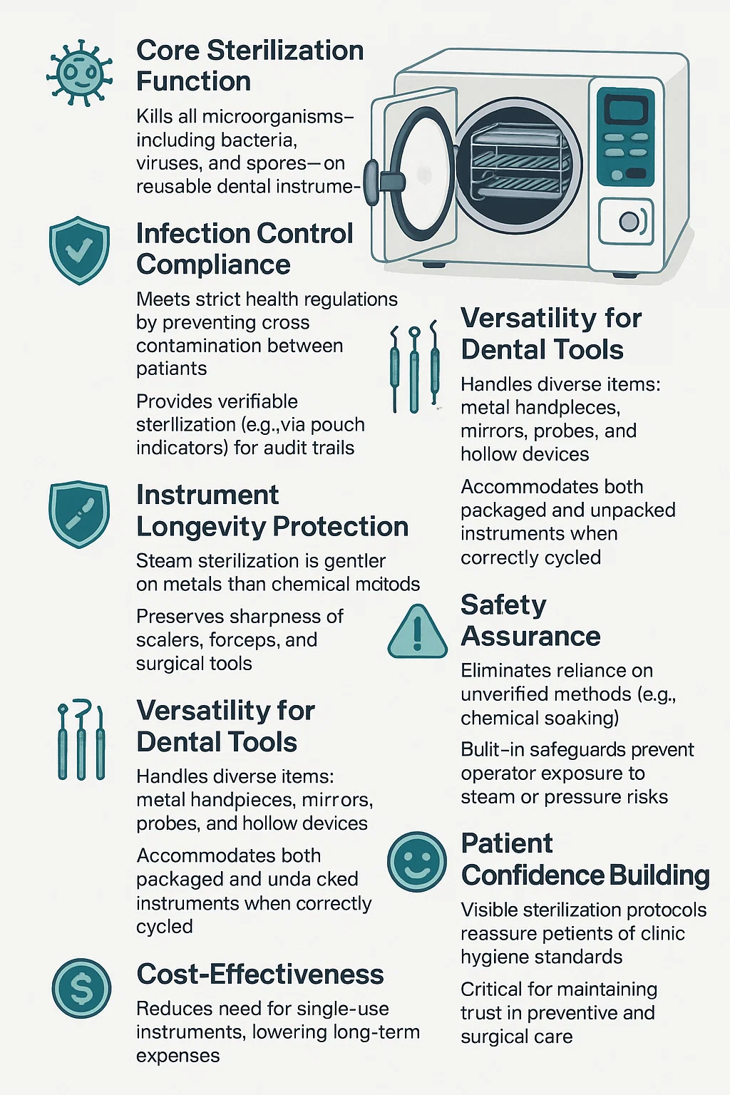 | Stérilise les instruments | Détruit toutes les bactéries, virus et spores | Garantit que les outils sont biologiquement sûrs pour la réutilisation |